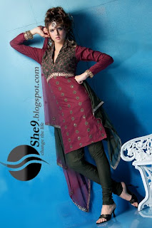 This dress is a New Indian Salwar kameez with latest churidar collection. The kameez has shoulderless neck in full sleeve style. Kameez is like a kurti in dark red color with beautiful and latest churidar collections salwar is in dark red color but the dupatta is in contrasted color with heavy motif work. This dress can be used as parties wear like wedding parts' mehndi functions and other evening parties.